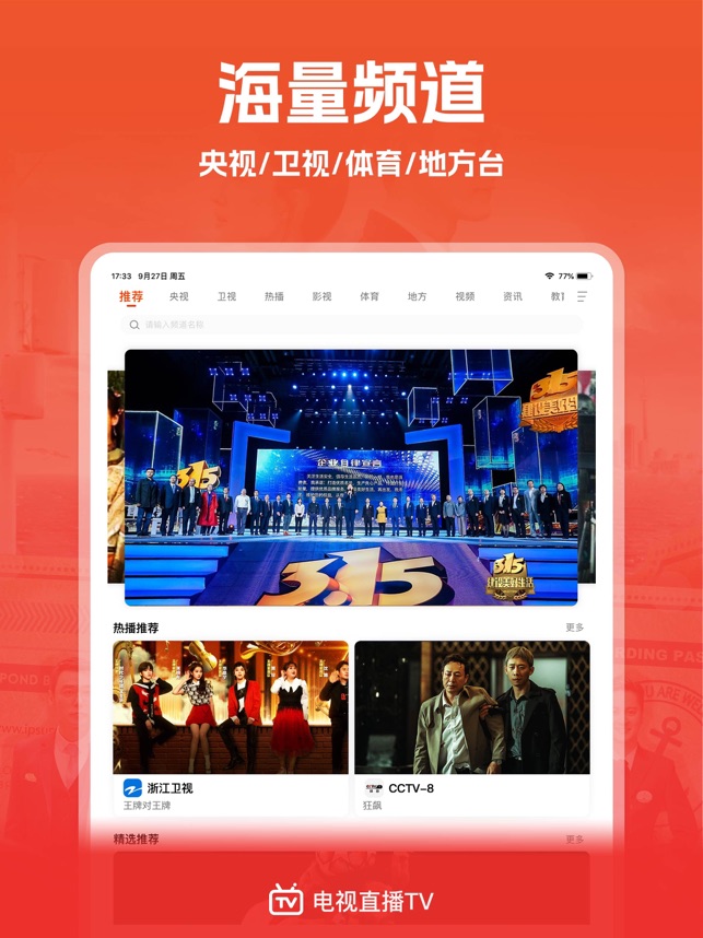央视:包含 CCTV1、CCTV13、CCTV4、CCTV6、CCTV8、CCTV 地理、CCTV-News、国防军事、证券资讯、风云音乐等,央视一套到央视十七套,你想看的央视直播、新闻联播、焦点访谈、新闻直播间,这里全都有!