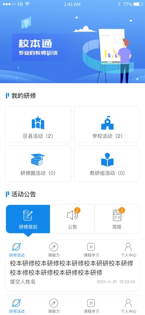 校本通是一款在教育行政部门、区县,教师培训机构的规划指导下,由学校组织领导,教师任职学校自主开展的研修活动