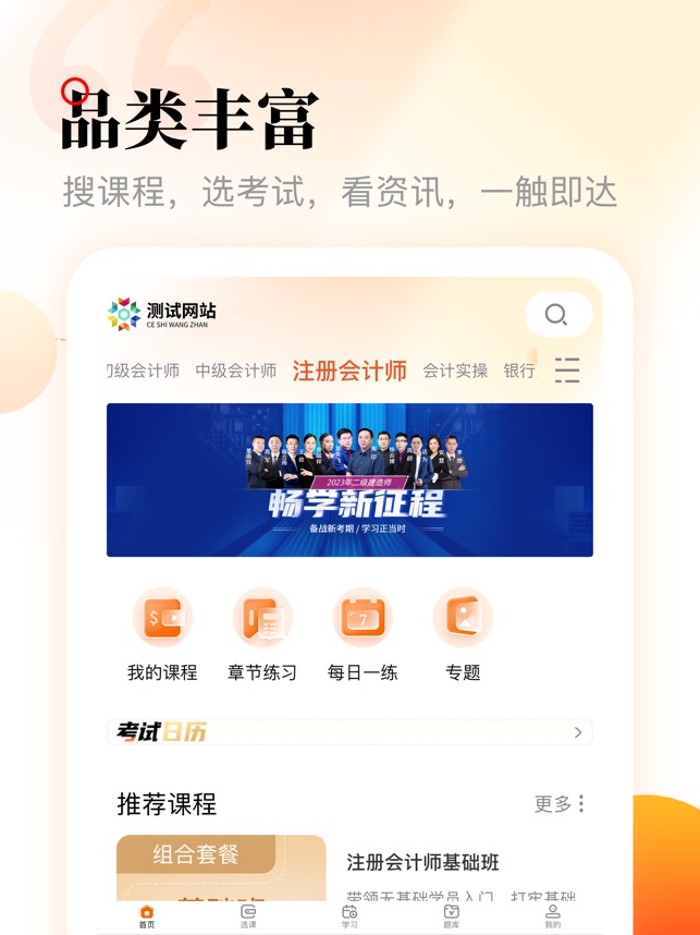 提供了课程学习、离线缓存、考试练习等贴心功能。
