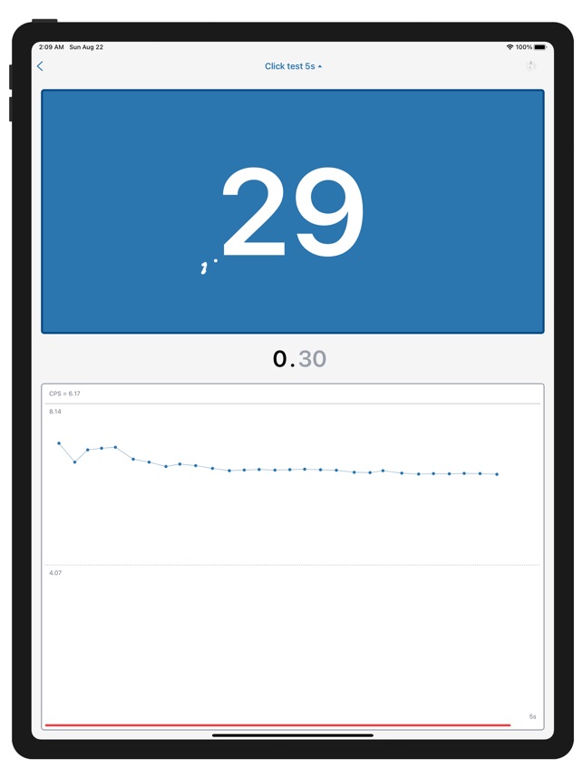 CPS-Test draws a chart of the click speed during the test so that you can see the change in the click speed over time. This is a very important function that helps to detect muscle fatigue, especially during prolonged testing.
