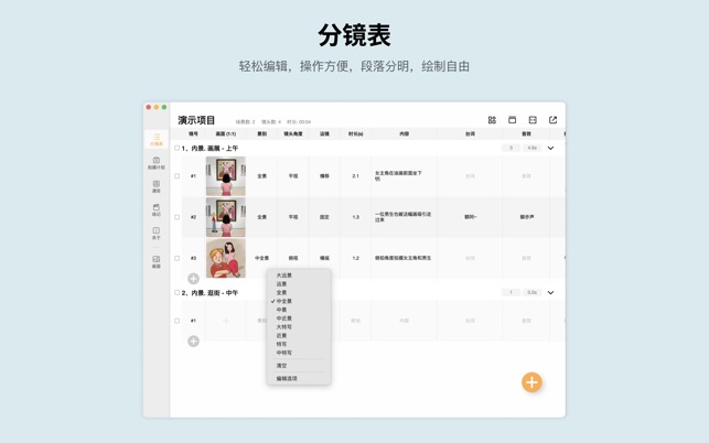 • 轻松编辑分镜表格,景别、运镜等多种信息支持选择和输入模式。