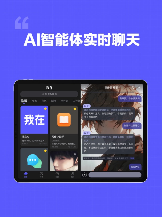 「我在 AI」是一款先进的 AI 智能体聊天平台,你可以在「我在 AI」和不同的智能体对话,体验不同的剧情,感受真实的爱恨情仇;还可以在「我在 AI」实现和 idol 的同框互动。