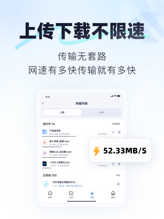 123 云盘上传下载不限速,誓将免费极速进行到底;超大 2T 网盘储存空间,海量视频照片随意保存;支持 100G 文件上传,大文件上传专属云盘