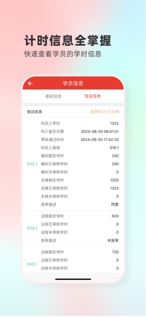 教练可以一键绑定学员,轻松创建学员档案,时刻掌握学员的基本信息、培训进度、考试成绩、做题记录、教学日志、预约记录等。帮助教练实现因材施教,提高培训效率和服务质量。