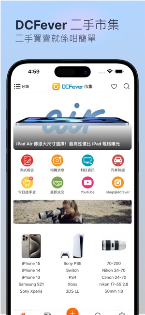 DCFever 二手市集是一個公平公開的買賣平台。會員可以安全快速地出售或購買不同種類的物品, 當中包括攝影產品、電子產品、電腦用品、家居用品、名錶以至時尚服裝產品等。以住在網上買賣平台放售產品的過程非常繁複, 通過 Fever 市集平台出售產只需幾個簡單的步驟, 大大縮短所需時間, 無論出售或購買物品都快人一步。如果你家中有任何不常用或閒置的物品, 立即刊登到 Fever 市集, 為它找到下一個新主人吧。除了可以套現及驣出家居空間外, 更重要是為環保出一分力。