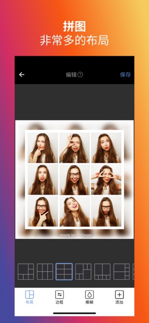 拼图大师(Collager) 是一款极其简单的拼图软件。提供了非常多设计精美的布局,可以快速将多张照片拼接成一张拼图。你还可以自定义布局,编辑照片。并且支持分享拼图给好友。
