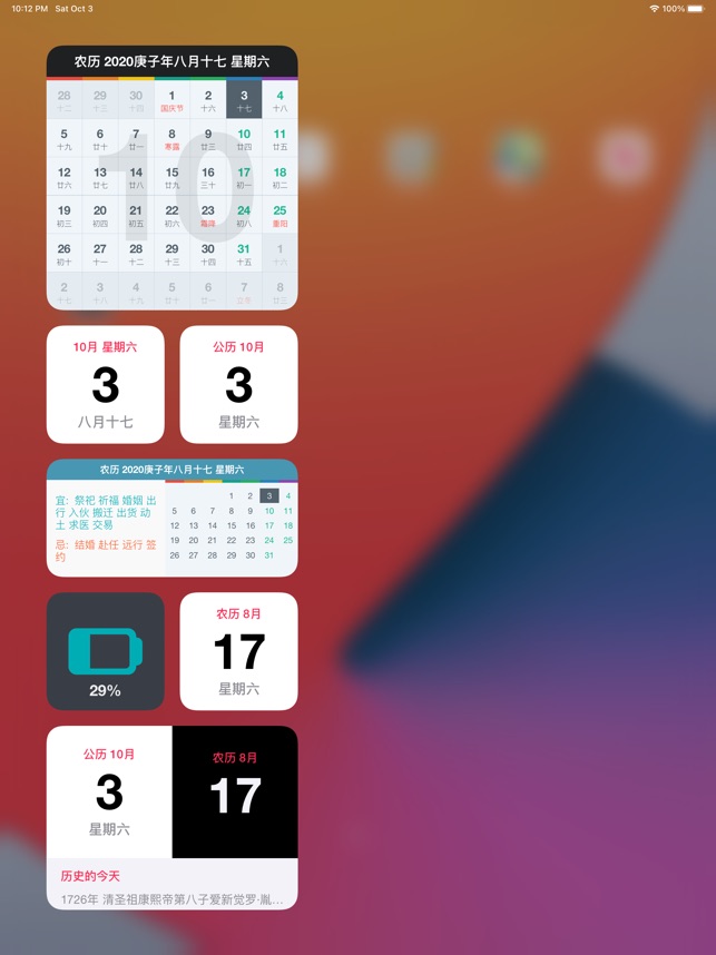 主要功能包含: 月历三件套、日历三件套、农历小单件、电池小单件