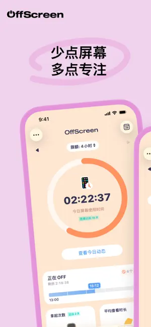 你是否有手机依赖症?无时无刻盯着屏幕,来来回回切换社交 APP,隔几分钟查看一次消息通知。从早到晚在手机上花了太多时间,工作和学习都无法专注。\\n\\n 如果你正在被「手机成瘾」分散着注意力,不如试一试 OffScreen, 它是 iOS 自带「屏幕时间」的完美搭档。\\n\\nOffScreen 将带你了解自己的手机使用状况,通过智能提醒、禁用 APP、番茄钟慢慢减少你对手机的依赖,找回专注力,回归生活。\\n\\n————\\n\\n- 人性化的屏幕使用时间统计,让你先了解自己\\n\\n* 统计每日屏幕时间、拿起次数、平均查看时长等 9 个维度数据\\n\\n* 每日动态,用时间轴展示每日玩手机次数\\n\\n* 设定目标,在即将触发目标的时候提醒你\\n\\n* 支持从健康读取其他睡眠分析类应用数据\\n\\n* 支持添加数据到你喜爱的 Watch 表盘\\n\\n- OFF 时间\\n\\n* 为社交应用设置禁用时间,享受 OFF 时光