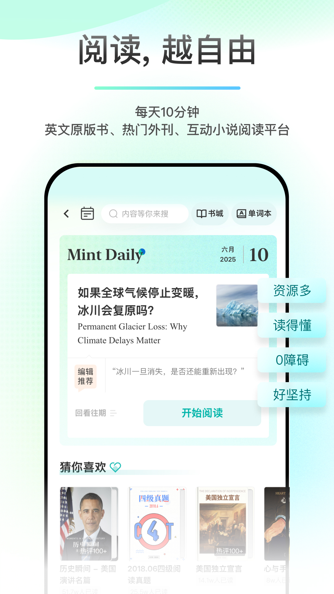 「薄荷阅读 MintReading」是“百词斩”旗下的高质量英文分级阅读平台,创立于 2016 年。9 年里,已有超过 1000 万人在这里读完了自己人生第一本英文书。