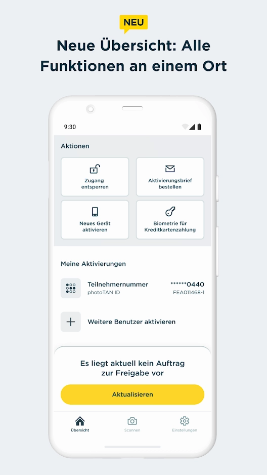 接收推送通知、检查订单、发布 - 借助全新的 photoTAN 推送功能,您只需一键点击即可快速、安全地发布订单。 photoTAN 扫描功能仍然为您提供扫描 photoTAN 图形以生成 TAN 的选项。