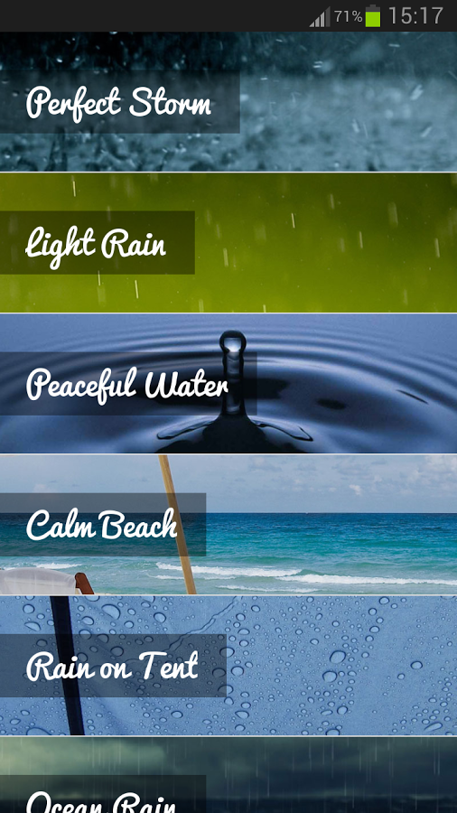 Relax your mind with beautiful high quality water sounds. Water sounds are perfect for relaxation and can be also used as sleeping music. You can enjoy sounds of the calming beach or light rain.Water Sounds App contains seven different high quality water melodiesSome of the great features:★ High quality water sounds★ Simple and beautiful design★ Timer - so the app turn off automatically★ Beautiful background images★ Install to SD CardYou can enjoy seven different water sounds:★ Perfect Storm★ Light Rain★ Peaceful Water★ Calm Beach★ Ocean Rain★ Rain on WindowWhether you love sounds of the rain or ocean you will sleep like a baby with this app.If you have any comment or suggestion please let me know so I can improve this app for you.