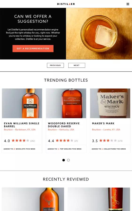 \\\"With expert ratings and thousands of data points, it's like a well-curated music feed, but for booze.” -- Gizmodo.comDistiller is your companion, guide, and collection as you grow the whiskey side of your life. Get a personalized whiskey recommendation for any situation, whether you’re at a bar with your friends, growing your personal collection, discovering a new flavor, or giving a gift. We go beyond the label to offer suggestions based on your tastes matched with the unique characteristics of each bottle.• Personalized recommendations• Rate bottles for tailored whiskey suggestions• Add favorites to your Top Shelf• Share your list as a not-so-subtle hint for the perfect gift!• Write your own tasting notes to document your whiskey journey• Unique Distiller Rating from our Tasting Table whiskey expert panelDistiller’s proprietary algorithm analyzes tens-of-thousands of data points across the complex flavors of whiskey along with the more discoverable attributes like price, reputation, and even \\\"giftability\\\". This algorithm produces the Distiller Flavor Profile, a new way of visualizing the whiskey’s flavor notes, and compares it to other bottles to help you find your best match.