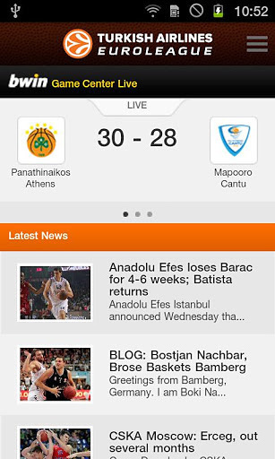 Put the Turkish Airlines Euroleague’s non-stop action in the palm of your hand with Euroleague Basketball Mobile! Install it on your device and start feeling DEVOTION! Euroleague Basketball Mobile!, the official Euroleague Basketball app, includes: BWIN GAME CENTER LIVE: Follow all the Euroleague action live with scores, play-by-play, real-time stats and team comparisons! RESULTS: Find all Euroleague results by group, by date and by team for this and all past seasons. STANDINGS: See where your team stands compared to opponents from phase to phase throughout the season. SCHEDULE: Know where, when and at what time your favorite teams will be playing all season long. PHOTOS: Get a courtside seat to see all the action to the last detail with the almost-instant images from every game. ON DEMAND VIDEOS: Watch a daily wave of highlights, top plays, MVP videos, interviews and much more. VENUE LOCATOR: Don\'t get lost on your way to the game! The venue locator shows you the exact location of all Euroleague arenas. TEAMS/ROSTERS: Keep track of all 24 team rosters, including player profiles and individual stats updated after each game. ALERTS: Select your favorite teams and activate push notifications to get the latest alerts of their results. The Euroleague.net mobile Android edition is the official Turkish Airlines Euroleague application that brings the best of European basketball directly to mobile devices. Install the application to follow Europe\'s top basketball competition to the last detail wherever you are. To get up-to-the-minute Turkish Airlines Euroleague news and entertainment, download the Euroleague.net Android edition of Euroleague Basketball Mobile!
