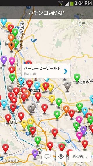 在使用 GPS 功能的当前位置的周边的地图弹珠场映射。我可以很容易地找到柏青哥店最近。 \\r