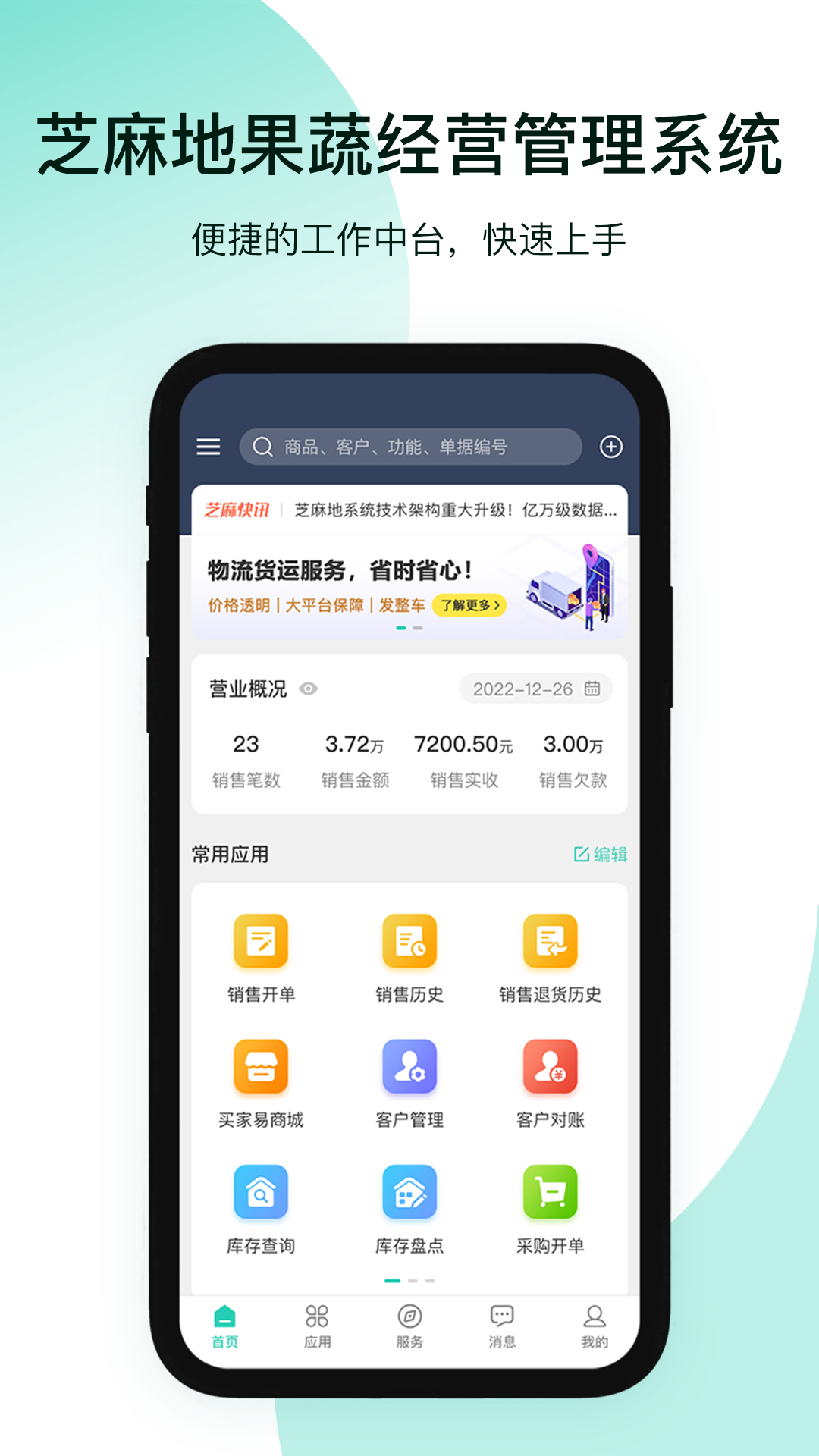 农产品企业经营管理系统(AEMS)是一款基于移动互联技术构建的云平台,主要围绕解决农产品批发过程中手工开单、进销存数据统计滞后、经营分析缺失、多店管理及对账难等农产品批发行业特有痛点。云平台功能包括:采购管理、销售管理、客户管理、供应商管理、代卖管理、对账管理、数据统计、经营状况分析、客户销售分析、商品销售分析、员工 KPI 考核等。除了手机 APP,我们还实现了 PC 端以及智能终端硬件系统操作,让您随时随地了解公司的运营状况。