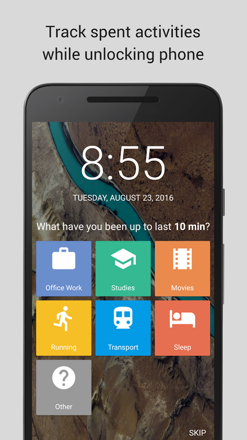 Average human being checks phone every 8 minutes, around 120 times a day. Save My Time is taking advantage of this habit. App replaces your standard lock screen and every couple minutes asks what you have been doing.