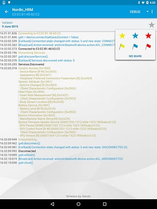 With nRF Logger installed developers may debug their apps when not connected to the computer. Log sessions may be also shared by customers to obtain detailed information. \\r