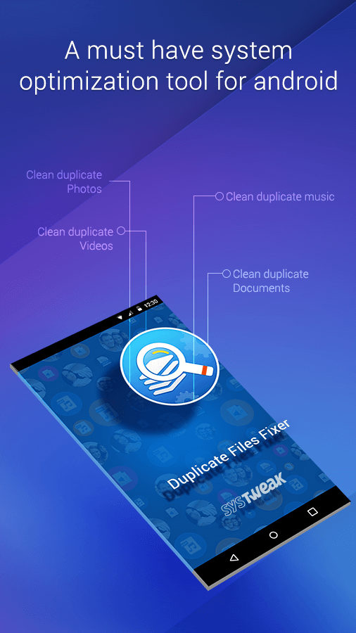 Systweak 的 Duplicate Files Fixer 是一款重複檔案的搜尋與移除程式,可掃描並刪除 Android 裝置上所有類型的重複檔案。 這款重複媒體移除程式能幫您的裝置復原大量的儲存空間,以便您能儲存更多資料或安裝 Play 商店上的其他應用程式,而不必面對低儲存空間警告。