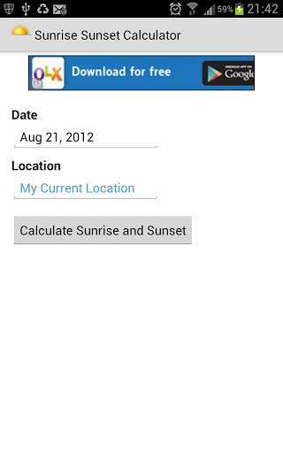 日出日落计算器是一个应用程序,让您找到您的当前位置或在地球上的任何给定的位置下列时间: 1)日出和日落 2)民事法律黎明和黄昏 3)航海黄昏与黎明 4)天文黄昏与黎明 计算完成使用 http://williams.best.vwh.net/sunrise_sunset_algorithm.htm 公式。需要注意的是,因为这些公式没有考虑到海拔的地方,计算值可能会略有不准确的地方,远高于海平面。