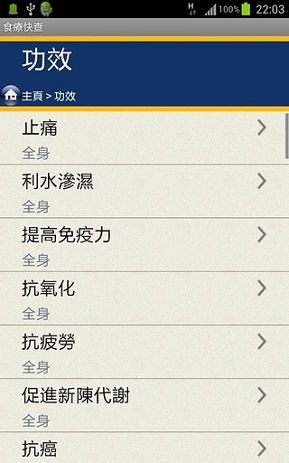 「医食同源,不药而愈」 身体有病时我们需要就医,但无病痛的时候,亦需要调理身体,所以「食疗」是日常健康的一个重要元素。 这就是一个有关食疗的手机分享程式,名称为「食疗快查」。 此程式最强之处在于能从多个不同角度(食物、身体部位、功效)进行快速,容易,直接的搜寻,令人了解食物对身体的不同益处,并能够找查相关的食疗。 另外,更有专题食疗,针对特定项目介绍相关的食物与食疗。 * 数据会不断更生,希望做到最少每月更生一次。 ** 由于此程式并非作医学用途,因此并不会对食物或功效作深入的解释。若有疑问,应先向医生查询,以免延误病情。 欢迎提供数据:joeva0501@gmail.com