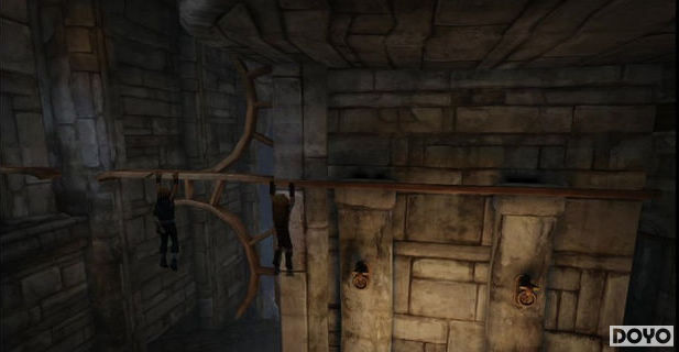 step6.兄弟两攀上墙体中的铜环(左摇杆↑、右摇杆↑)抬头往上看,(松开 LT、RT 键)往上跳然后在马上(按 LT、RT 键)抓住上层的铜环,如此类推跳到铜架上并往左侧移动。