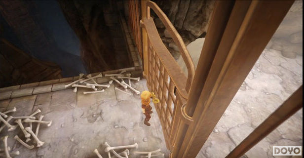 最终两兄弟来到了之前巨人的妻子所囚禁的笼子前,首先需要让弟弟先钻进笼子里并且绕过地上的骨头(按 RT 键)盗取守卫巨人屁股上的金钥匙,然后走到巨人妻子笼子前为其(按 RT 键)解锁,然后哥哥在台子上(按 LT 键)拉动把手,释放巨人妻子。