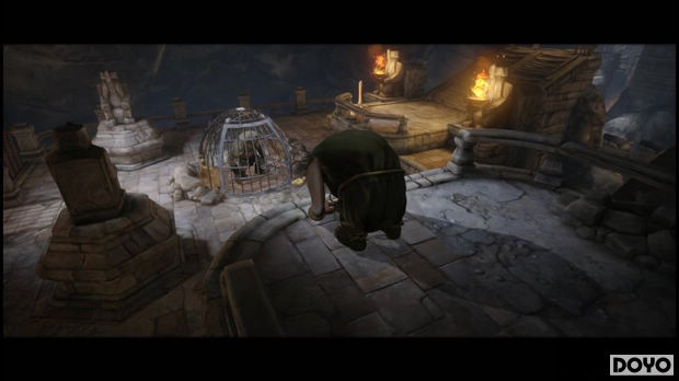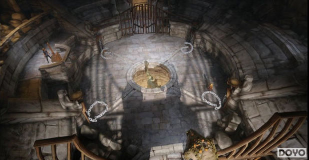 step10.让哥哥站在拉杆台子守候,然后操控弟弟来到圆坛四个铁链火炬台前呼叫,然后守卫巨人就会撞击火炬台从而导致铁链断裂;铁链断裂,哥哥就可以拉动杆子打开中间的井盖。