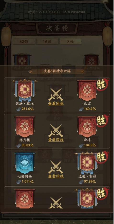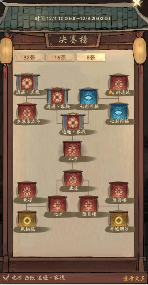 决赛最后八强如下图所示,分别是【灯火阑珊处丶】、【疏影暗香】、【学海无涯】、【记忆家】、【重楼】、【镜花水月】、【沽酒待君归】、【蜜雪冰城】。其中夺冠种子两支商会都在其中。